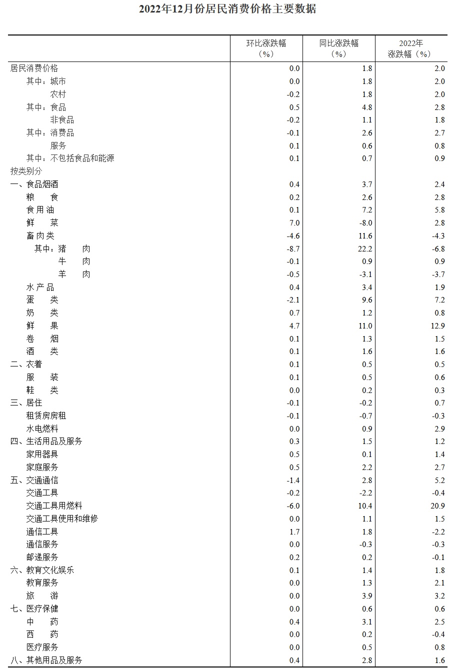 2022年12月份居民消费价格同比上涨1.8% 环比持平