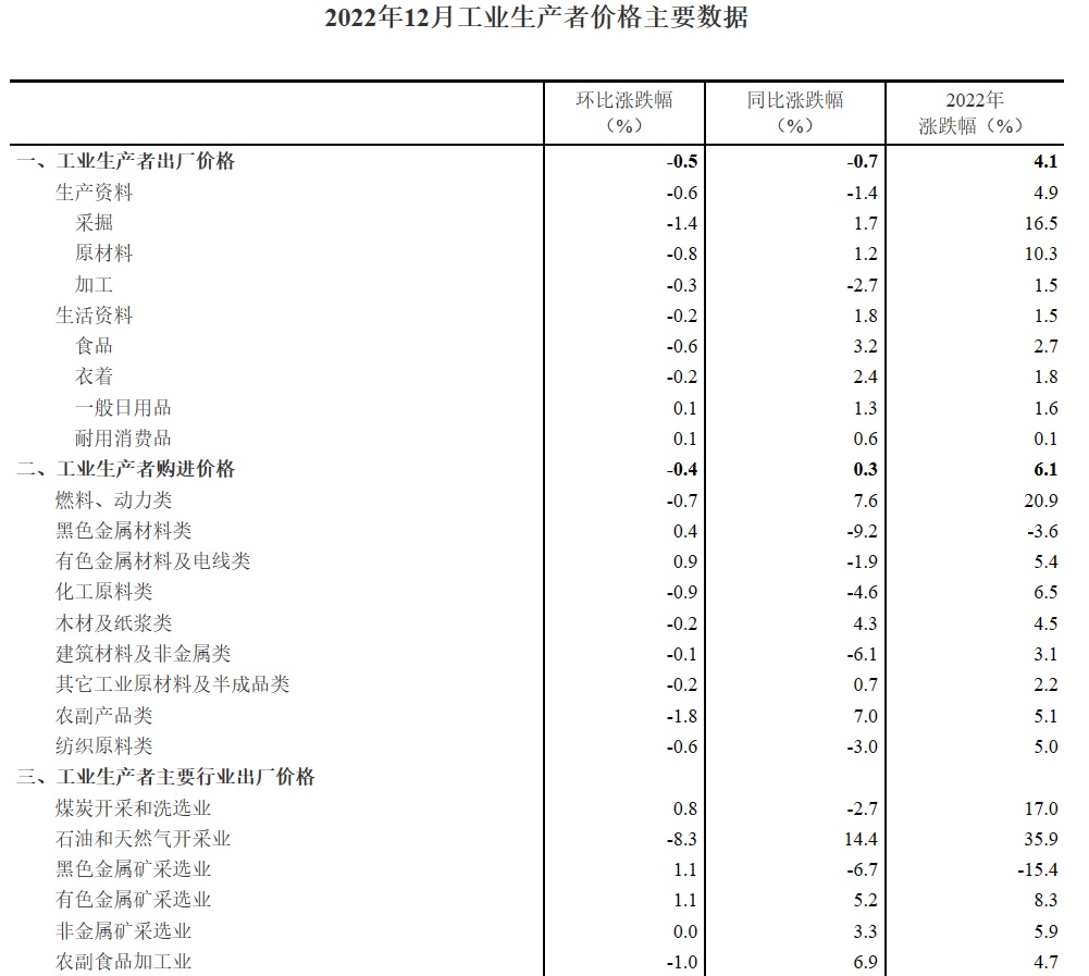 2022年12月份,全国工业生产者出厂价格同比下降0.7%,环比下降0.5%;工业生产者购进价格同比上涨0.3%,环比下降0.4%。2022年全年,工业生产者出厂价格比上年上涨4.1%,工业生产者购进价格上涨6.1%。