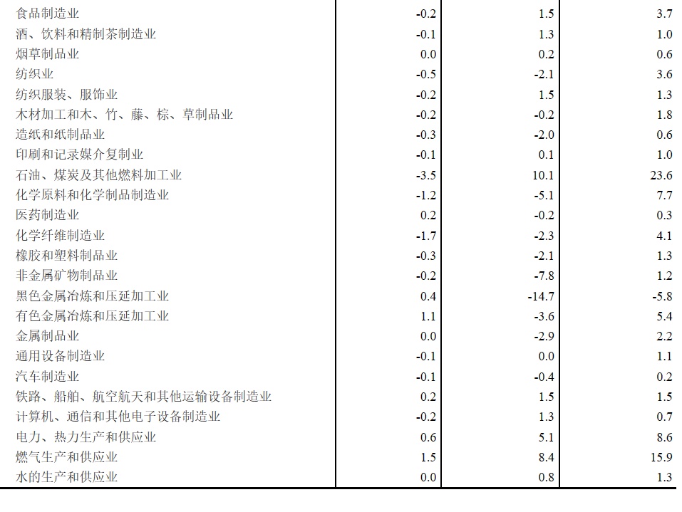 工业生产者购进价格中,农副产品类价格下降1.8%,化工原料类价格下降0.9%,燃料动力类价格下降0.7%,建筑材料及非金属类价格下降0.1%;有色金属材料及电线类价格上涨0.9%,黑色金属材料类价格上涨0.4%。