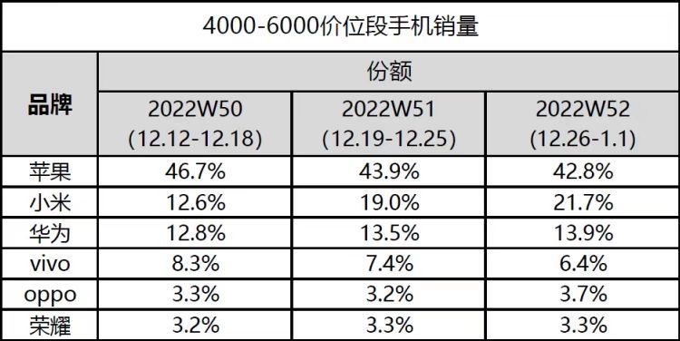 据悉,小米13系列于2022年12月14日上市销售,此后小米4000-6000元价位段市场份额连续两周增长,周均增长超4%,为国内该价位段市场份额周增速第一。