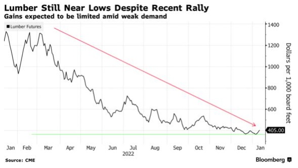 木材的价格下滑使其成为去年表现最差的大宗商品,价格变化幅度较其2021年创下的历史新高戏剧性逆转,彼时由于北美房地产行业于疫情期间建造或翻修房屋,导致市场出现供应紧张。