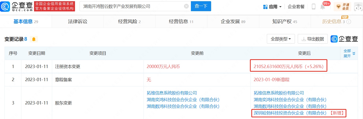 智通财经APP获悉,企查查APP显示,1月11日,湖南开鸿智谷数字产业发展有限公司(下称:开鸿智谷)发生工商变更,新增深圳哈勃科技投资合伙企业