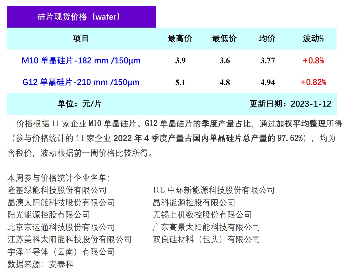 /150μm)价格区间在3.6-3.9元/片,成交均价提升至3.77元/片,周环比涨幅为0.8%;G12单晶硅片(210