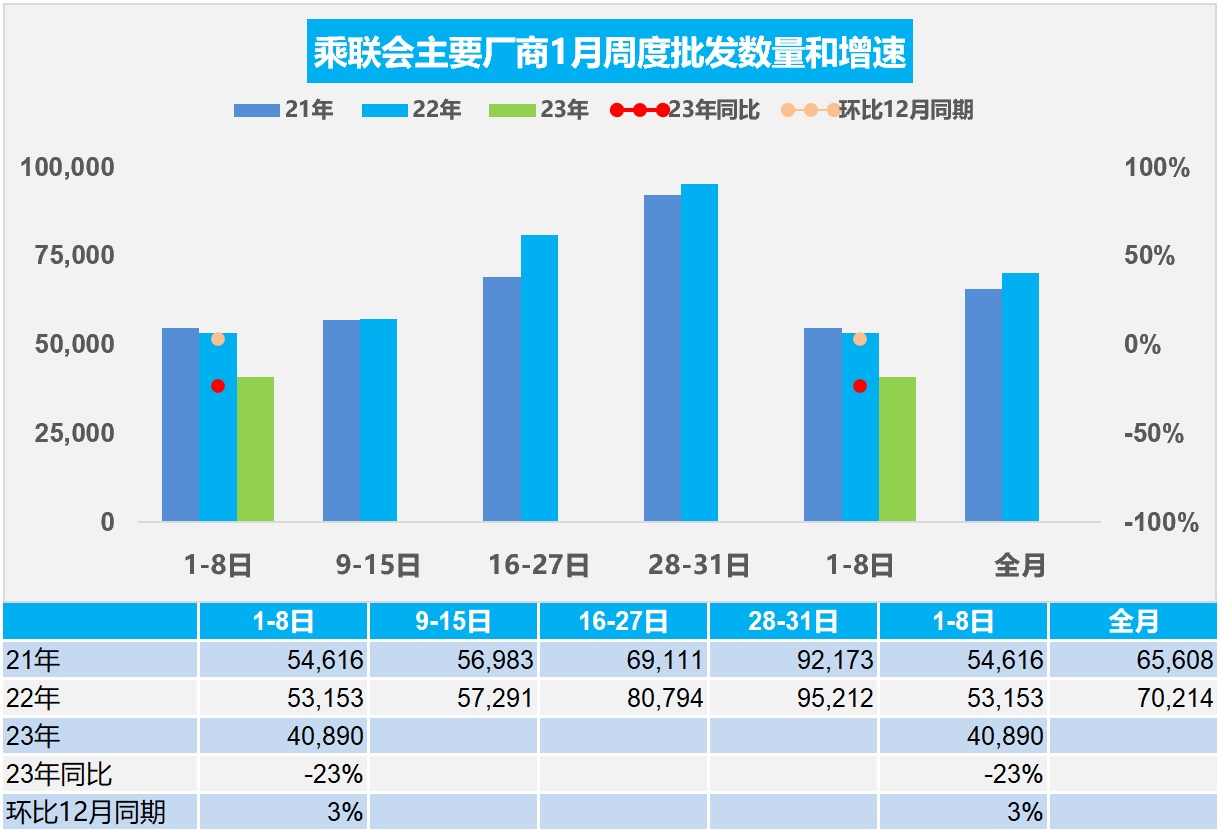 2023年1月1-8日全国乘用车厂商批发32.7万辆,日均达到4.1万辆,同比去年下降23%,较上月同期增长3%。