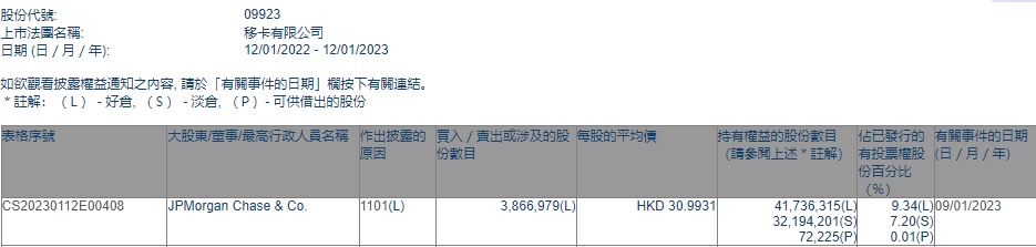 智通财经APP获悉,香港联交所最新资料显示,1月9日,JPMorgan Chase & Co增持移卡(09923)386.6979万股,每股作价30.9931港元,总金额约为1.2亿港元。增持后最新持股数目约为4173.63万股,最新持股比例为9.34%。