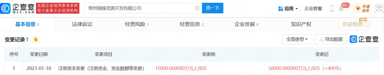 智通财经APP获悉,企查查APP显示,近日,常州锦蜂资源开发有限公司发生工商变更,注册资本由1亿人民币增至5亿人民币,增幅400%。股东信息显示,该公司由蜂巢能源科技股份有限公司全资持股。据公开资料显示,该公司成立于2022年9月,法定代表人为杨红新,经营范围含选矿;矿物洗选加工;常用有色金属冶炼;工程和技术研究和试验发展;新材料技术研发等。