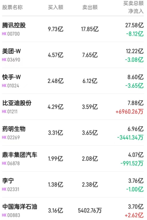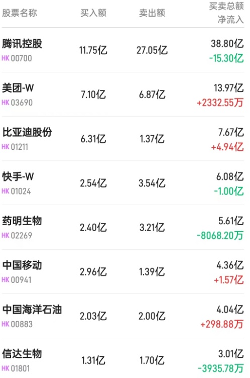 北水净买入最多的个股是比亚迪股份(01211)、中国移动(00941)、中海油(00883)。北水净卖出最多的个股是腾讯(00700)、李宁(02331)、信达生物(01801)。