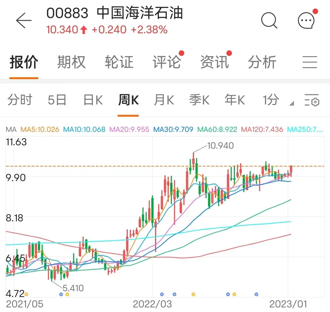 智通财经APP获悉,1月11日晚间,中海油(00883)发布2023年经营策略和发展规划。2023年,公司上调产量目标和资本支出预算,净产量目标为6.5-6.6亿桶油当量,较2022年预计净产量6.2亿桶增长约4.8%-6.5%,资本支出预算总额为1000-1100亿元人民币。2022-2024年,全年股息支付率预计不低于40%;同期股息绝对值不低于每股0.7港元。1月12日,石油板块延续强势,中海油收报10.34元,上涨2.38%,股价距离2022年最高点10.94元也只有一步之遥。