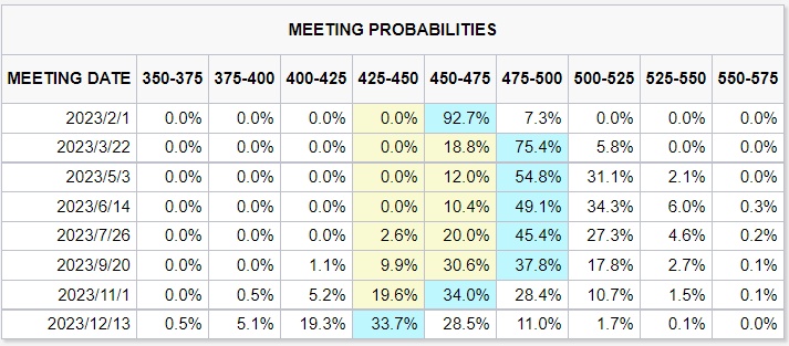 根据芝商所的加息概率统计,利率期货市场押注美联储将在美东时间2月1日将加息幅度进一步放缓至25个基点,今日这一比例一度达到94.7%。除了押注下次加息幅度,多数交易员们还押注,3月份美联储将再度加息25个基点,然后暂停加息,在年底前将联邦基金利率下调至多50个基点。
