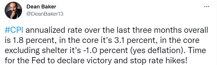 美国智库“经济政策研究中心”资深经济学家迪恩·贝克(Dean Baker)的观点更加坚定。贝克在推特上发文称:“美联储是时候宣布胜利并停止加息了!”他在文中强调,服务业通胀减去住房成本后长达三个月的下降趋势,证明高通胀‘彻底落败’。”