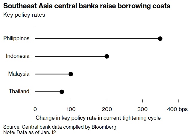 根据调查的预测中值,印尼、菲律宾和泰国的政策制定者将在未来几个月内分别将借贷成本上调50个基点,然后达到利率峰值。与此同时,马来西亚将以再加息25个基点来结束加息周期。