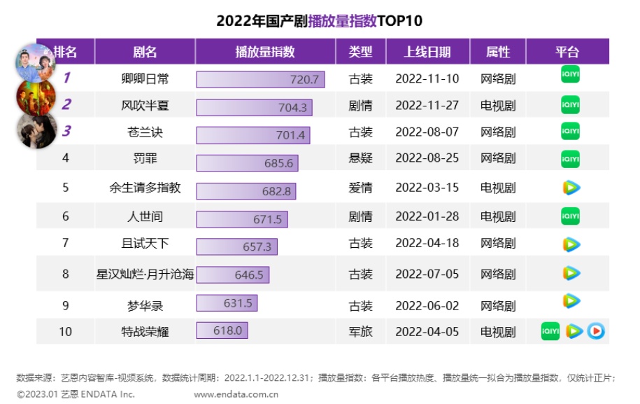 在保持市场产能的同时,爱奇艺的内容的热度和口碑亦表现出色。口碑层面,豆瓣官方发布的2022年度华语剧集榜单中,前10名有7部来自爱奇艺出品。热度层面,云合数据显示,全网连续剧有效播放TOP20中,爱奇艺以14部作品领跑。艺恩2022国产剧播放量指数TOP10中,爱奇艺有6部上榜,且榜单前四名均为爱奇艺独播剧。