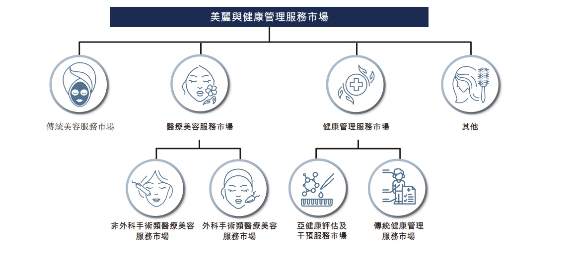 据悉,美丽与健康管理服务的概念指协助消费者维持及改善外形与身体健康的一系列广泛服务,包括传统美容服务、医疗美容服务、健康管理服务及其他。其中,医疗美容服务可进一步分类为非外科手术类医疗美容服务及外科手术类医疗美容服务,健康管理服务则指为健康及亚健康人士提供的一站式体检、咨询及干预服务。近年来,随着人均收入提升、健康美丽消费意识增强,这一行业扩容迅速,至2021年市场规模已经达到12,365亿元。