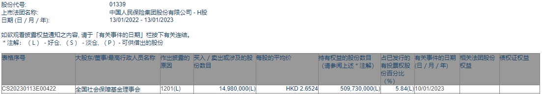 智通财经APP获悉,香港联交所最新资料显示,1月10日,全国社会保障基金理事会减持中国人民保险集团(01339)1498万股,每股作价