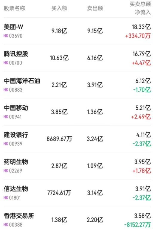 北水净买入最多的个股是腾讯(00700)、中国移动(00941)、药明生物(02269)。北水净卖出最多的个股是建设银行(00939)、信达生物(01801)、中海油(00883)。