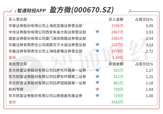 盈方微(000670.SZ):多主力现身龙虎榜,机构与游资出现分歧,机构席位卖出328万元,买一是知名游资炒新一族的席位买入3616万元,买二是顶级游资方新侠的席位买入2866万元,当日净买入1.08亿元,该股调整充分,强势突破所有均线,预计走趋势为主。