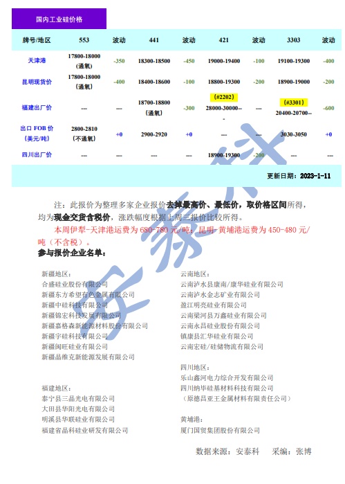 智通财经APP获悉,1月13日,据硅业分会数据,本周工业硅市场成交极为清淡,硅价继续下跌。其中,冶金级下跌100-450元/吨,主流价格在17800-18800元/吨;化学级下跌100-200元/吨,主流价格在18900-19400元/吨。同时,铝合金ADC12价格上涨200元/吨,主流报价18900元/吨;有机硅DMC价格暂无变化,主流报价16800元/吨。
