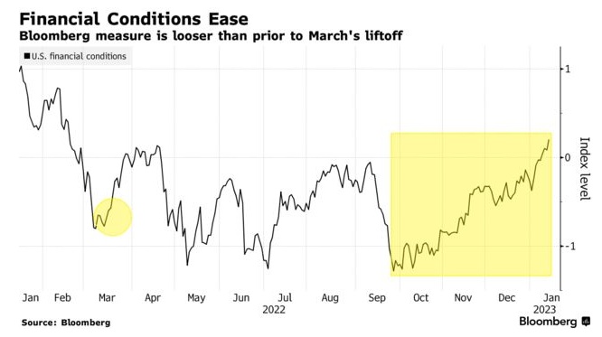 关于股票和债券市场不断上涨对通胀影响的争论,已经变成了美联储面临的一个更大问题——尽管越来越多的证据表明,美国经济其他领域的价格压力已经见顶。根据一项指标显示,尽管在加息425个基点后,消费者成本数据有所降温,但金融状况(衡量资产类别压力的指标)比去年3月美联储加息前的水平更为宽松。