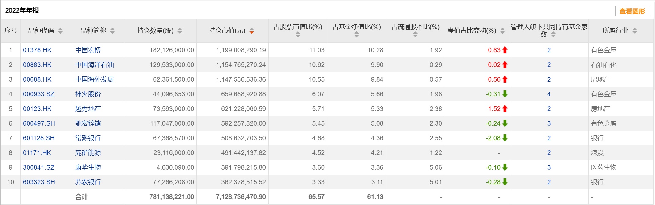 重仓股方面,该基金前十大重仓股分别为中国宏桥(01378)、中国海洋石油(00883)、中国海外发展(00688)、神火股份(000933.SZ)、越秀地产(00123)、驰宏锌锗(600497.SH)、常熟银行(601128.SH)、兖矿能源(01171)、康华生物(300841.SZ)、苏农银行(603323.SH)。