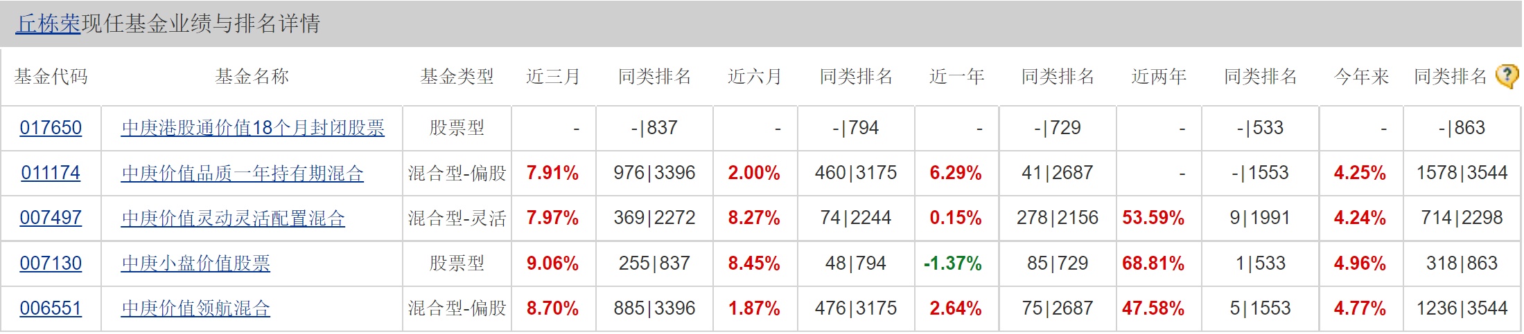 值得一提的是,丘栋荣旗下四只产品近六个月均实现正回报。天天基金网数据显示,近六个月,中庚小盘价值股票、中庚价值灵动灵活配置混合均居前位。