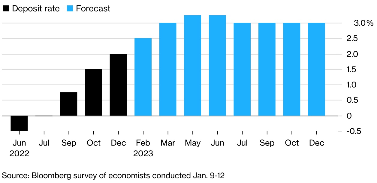 经济学家预计,欧洲央行存款利率将从目前的2%分三步上调至3.25%的峰值。他们预测,欧洲央行将在2月和3月的会议上分别加息50个基点,随后在5月或6月加息25个基点。此外,经济学家的预测中值显示,该利率将在第三季度初降至3%。