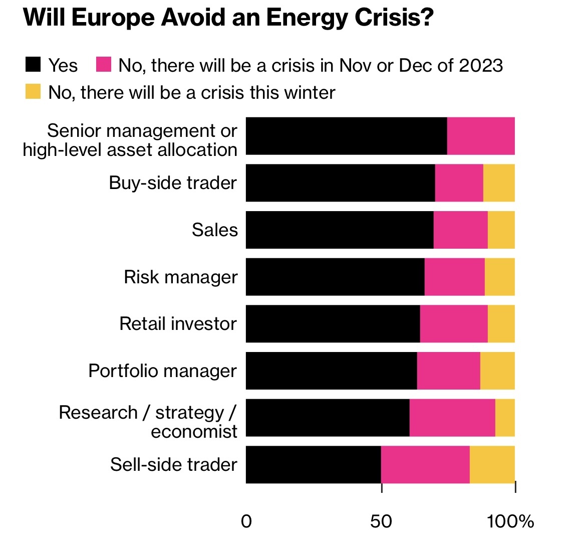 尽管欧洲的整体通胀可能很棘手,但至少它正在下降。温和的天气导致燃料消耗下降,天然气价格暴跌,库存比往年这个时候更充足。这导致超过60%的MLIV调查参与者认为,欧洲在2023年可以避免能源危机。