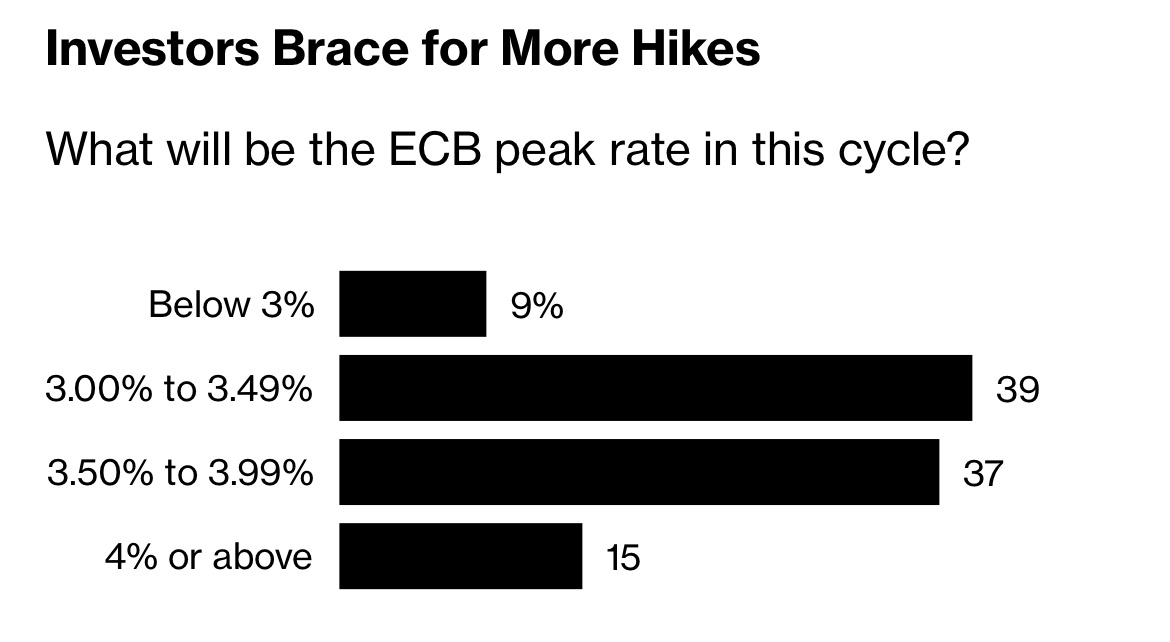 根据与欧洲央行利率决议会议相关的掉期交易,市场对欧洲央行峰值利率的押注最近几天有所下滑,对7月份利率的押注已跌至3.5%以下。超过一半的受访者认为利率要到第三季度或更晚才会见顶。