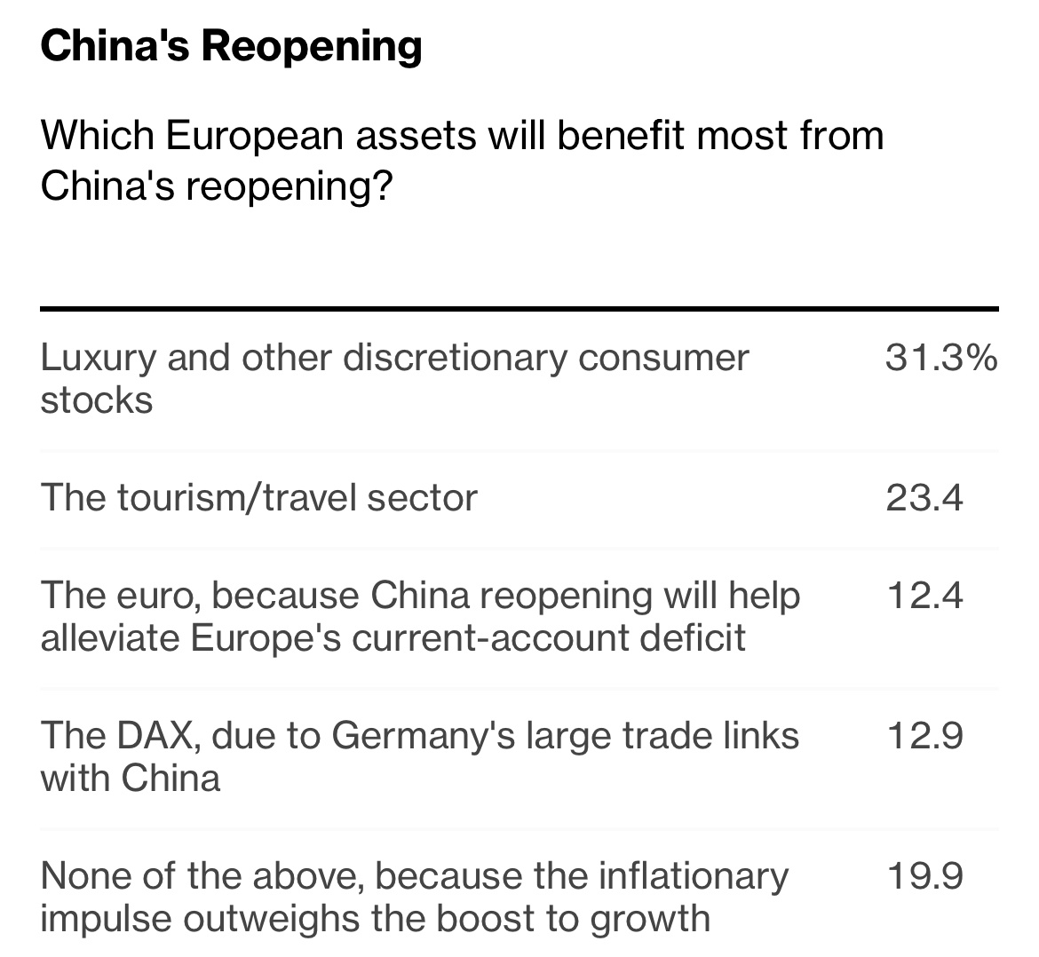 此外,中国重新开放,预计将提振中国对欧洲商品的需求。受访者认为欧洲奢侈品和其他非必需消费类股是最大的受益者,其次是旅游和旅游业,这并不令人意外。