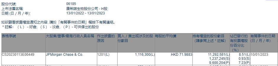 智通财经APP获悉,香港联交所最新资料显示,1月10日,小摩减持康希诺生物(06185)111.63万股,每股作价71.9883港元,总金额约为8036.05万港元。减持后最新持股数目约为1129.26万股,最新持股比例为8.51%。