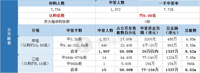 其中,公开配售申购人数7754人,一手中签率7.72%,认购倍数约9.88倍。