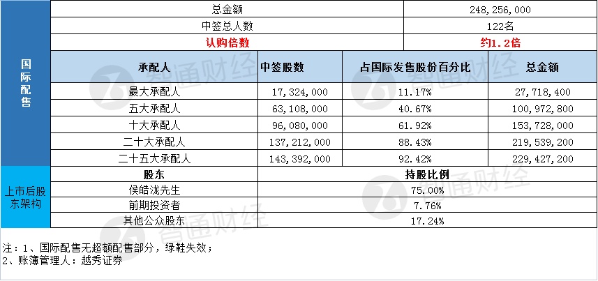 国际配售申购人数未披露,认购倍数约1.2倍。