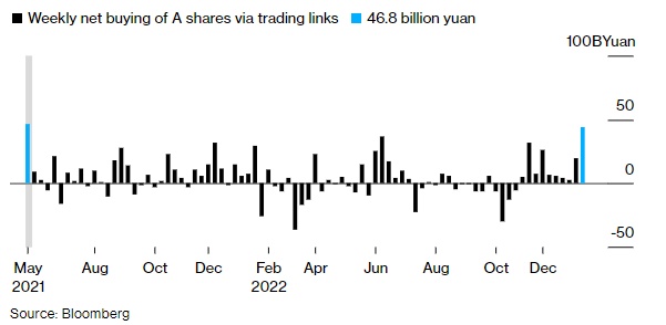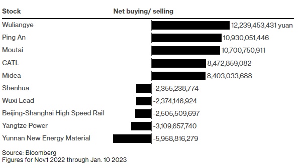 据调查数据显示,由于市场预计需求将出现反弹,在截至1月10日的10周内,外国投资者通过与香港的贸易联系,买入了人民币约120亿元(合18亿美元)的白酒公司五粮液(000858.SZ),随后买入了人民币逾100亿元的烈酒生产商贵州茅台(600519.SH)。在此期间,他们还买入了中国平安(601318.SH)类似规模的股票。