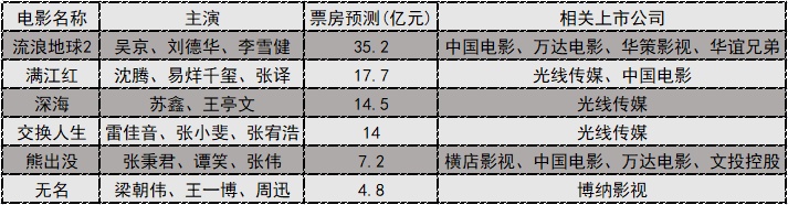 据不完全统计,春节定档电影有超过80家公司(未去重)参与出品发行环节。相关公司及票房数据方面,据行业媒体、天风证券、猫眼专业版等机构预测综合后,结果如下: