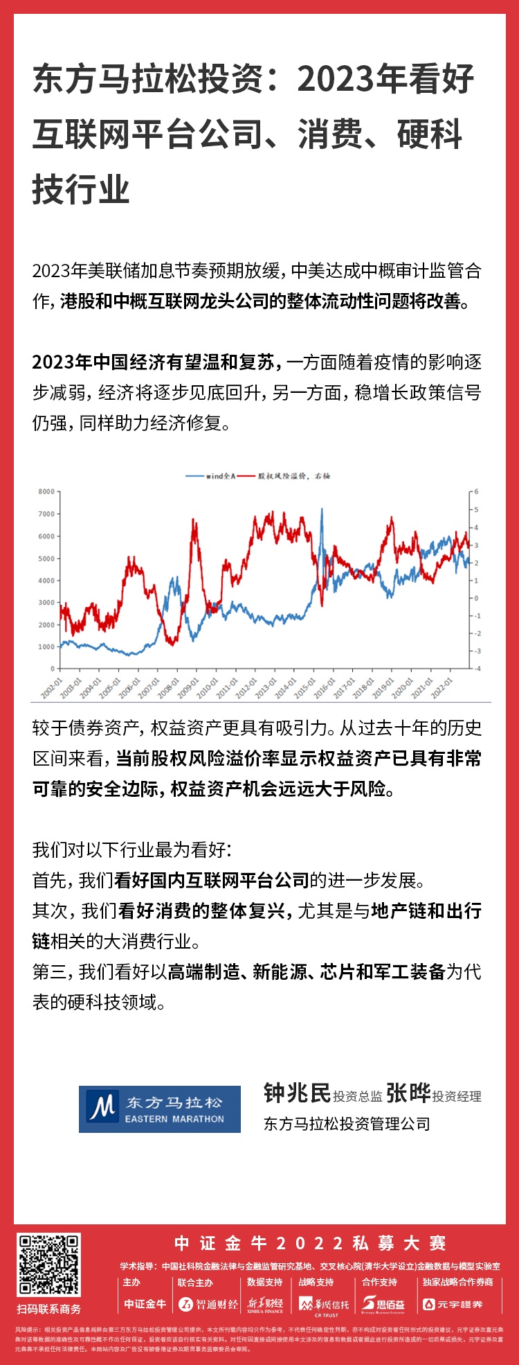 东方马拉松投资指出,2023年美联储加息节奏预期放缓,中美达成中概审计监管合作,港股和中概互联网龙头公司的整体流动性问题将改善。2023年中国经济有望温和复苏,一方面随着疫情的影响逐步减弱,经济将逐步见底回升,另一方面,稳增长政策信号仍强,同样助力经济修复。较于债券资产,权益资产更具有吸引力。从过去十年的历史区间来看,当前股权风险溢价率显示权益资产已具有非常可靠的安全边际,权益资产机会远远大于风险。