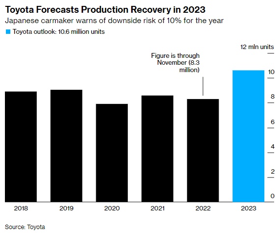 丰田周一表示,“目前,我们正在努力实现2023年产量上限为1060万辆的目标,”并补充说,“下行风险波动范围约为10%。”