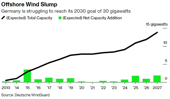 然而,根据几家行业协会周一发布的一份联合报告,目前德国海上发电的装机容量仅为8.1吉瓦,这使得这些该国绿色目标难以实现。2022年,只有一个装机容量为342兆瓦的海上项目上线,今年预计仅增加247兆瓦。