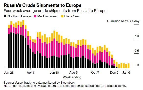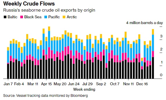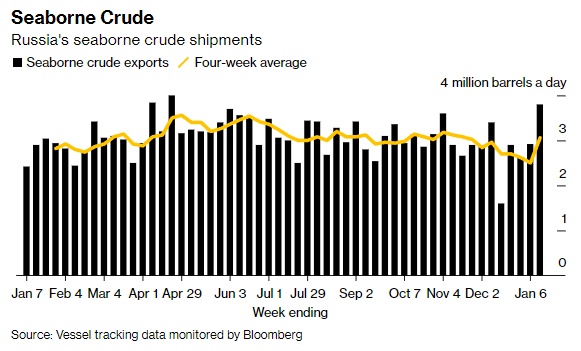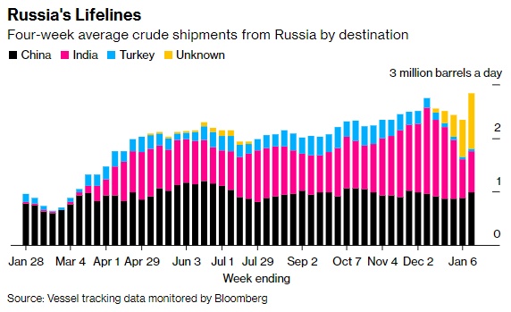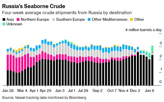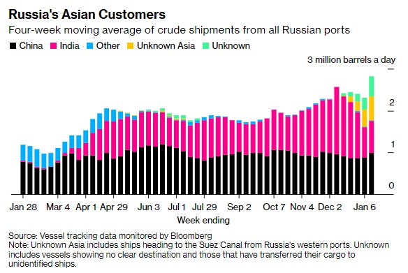 在截至1月13日的四周时间里,俄罗斯向亚洲客户的平均原油出货量,加上没有最终目的地的船只(通常最终目的地不是印度就是中国),跃升至每天282万桶的新高。