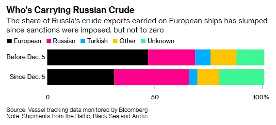 自制裁实施以来,欧洲船舶运载的俄罗斯原油出口份额有所下降,但并未降至零
