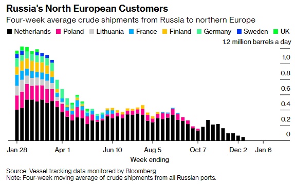 来自波罗的海、黑海和北极的出口码头每天消耗150多万桶短途原油的市场已经几乎完全消失,取而代之的是成本更高、耗时更长的亚洲长途目的地。