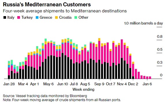 土耳其是俄罗斯海运原油进入地中海的唯一目的地,但那里的原油流量已经回落到俄乌冲突之前的水平。土耳其是冲突开始后增加进口的国家之一,但令人惊讶的是,土耳其不是欧盟进口禁令的缔约方,在欧洲买家避开俄罗斯原油后,土耳其一直被视为该国原油的关键市场。