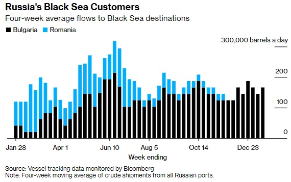 在截至1月13日的28天里,俄罗斯对欧洲国家的海运原油出口小幅上升至每天16.7万桶,保加利亚是俄罗斯唯一的欧洲目的地。这些数字不包括运往土耳其的货物。