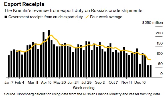 来自原油出口关税的资金流入俄罗斯政府的增长幅度要小得多。最近一周装运的所有货物都按1月份的低税率征税,而前一周装运的几批货物则按12月份的税率征税,后者的税率是1月份的2.5倍多。这在一定程度上是由于用于计算税率的公式发生了变化,因为该国通过增加生产负担,继续长期转向对出口征税。