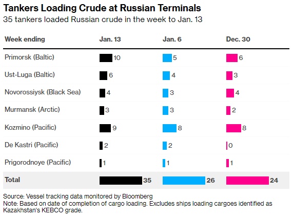 船舶跟踪数据和港口代理报告显示,在截至1月13日的一周内,共有35艘油轮装载了2660万桶俄罗斯原油。这比前一周增加了610万桶,增幅达30%。目的地是基于船舶在本文时发出的航行方向信号,其中一些目的地几乎肯定会随着航行的进行而改变。所有数据都不包括被确定为哈萨克斯坦KEBCO等级的货物。