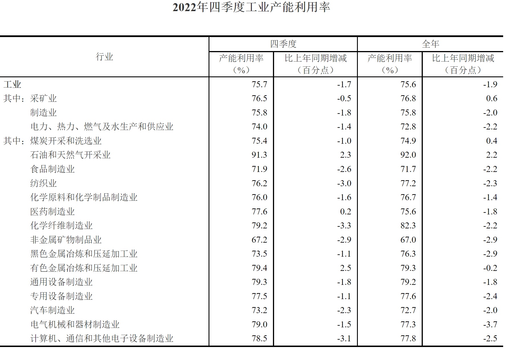 四季度,全国工业产能利用率为75.7%,比上年同期下降1.7个百分点,比上季度回升0.1个百分点。2022年全国工业产能利用率为75.6%,比上年下降1.9个百分点。