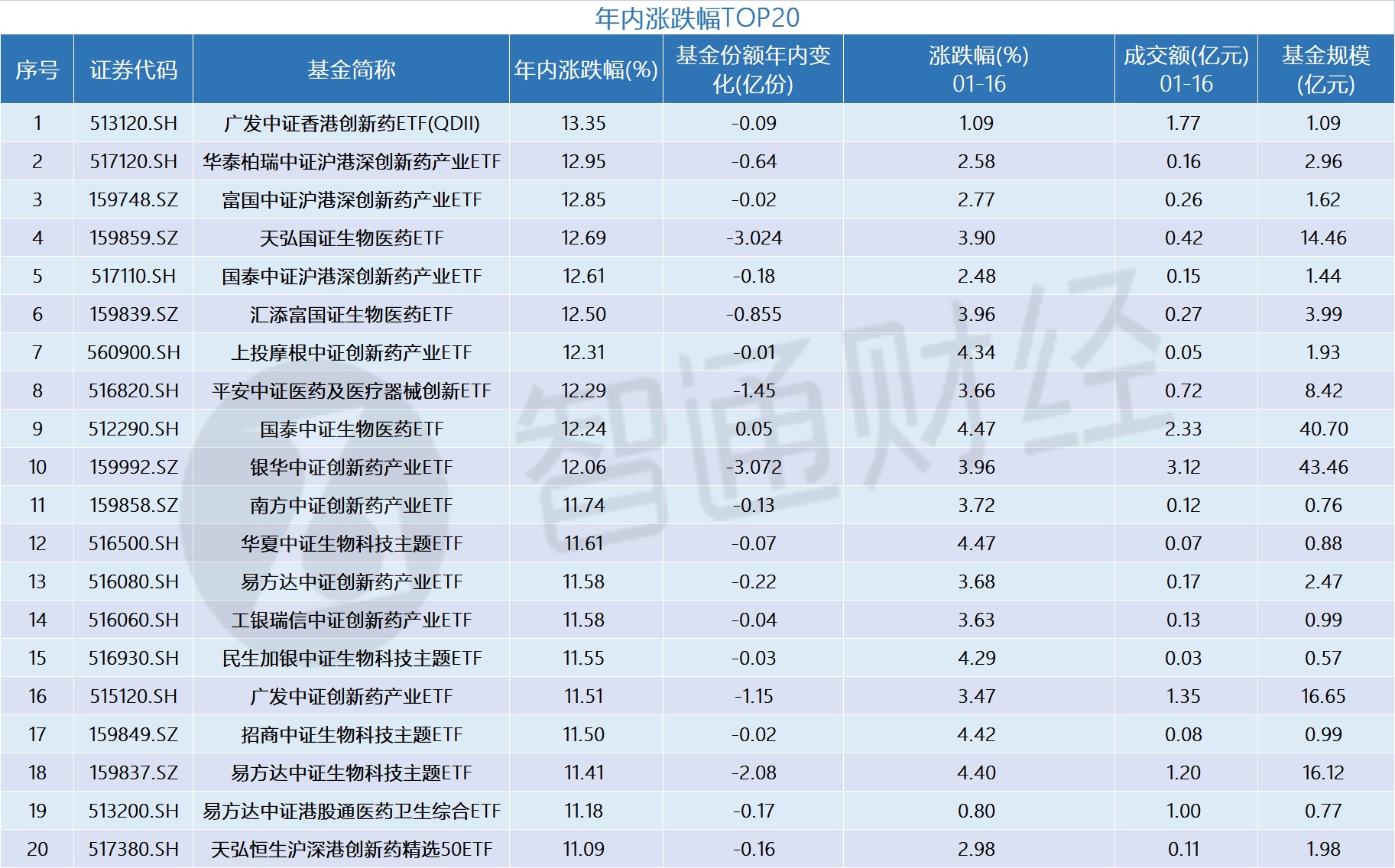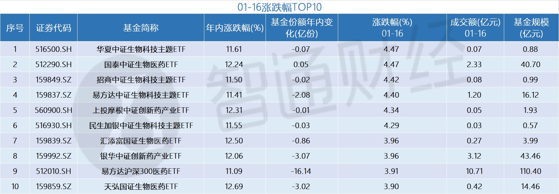 1月16日,华夏中证生物科技主题ETF、国泰中证生物医药ETF、招商中证生物科技主题ETF、易方达中证生物科技主题ETF、上投摩根中证创新药产业ETF、民生加银中证生物科技主题ETF涨幅均超过4%,其中,华夏中证生物科技主题ETF单日涨幅达4.47%,当日成交额为723万元。此外,易方达沪深300医药ETF1月16日单日涨幅达3.91%,单日成交额达10.71亿元。