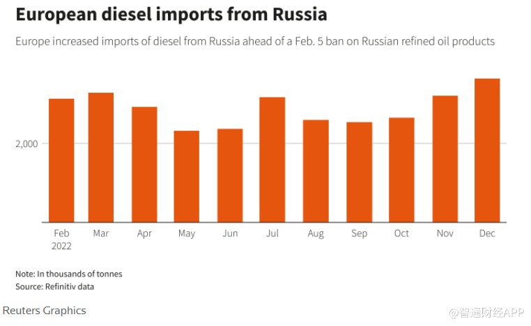 Refinitiv的数据显示,尽管在俄乌冲突爆发后,各国政府和企业试图切断与俄罗斯的经济联系,但欧洲去年进口的柴油有近一半依赖俄罗斯。