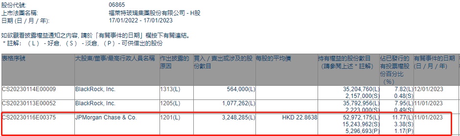 智通财经APP获悉,香港联交所最新资料显示,1月11日,小摩减持福莱特玻璃(06865)324.8285万股,每股作价22.8638港元,总金额为7426.81万港元。减持后最新持股数目约为5297.22万股,最新持股比例为11.77%。
