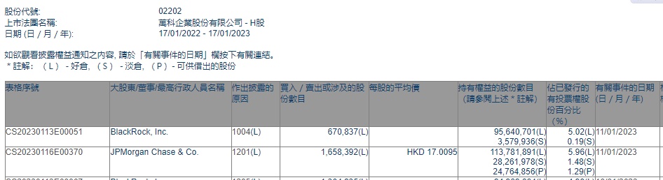 智通财经APP获悉,香港联交所最新资料显示,1月11日,小摩减持万科企业(02202)165.8392万股,每股作价17.0095港元,总金额约为2820.84万港元。减持后最新持股数目约为1.14亿股,最新持股比例为5.96%。