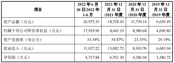 财务方面,于2019年、2020年、2021年及2022年上半年,公司实现营业收入分别为6683.94万元、8303.76万元、1.51亿元以及1.10亿元;同期,实现净利润分别为3580.72万元、4286.94万元、6701.30万元以及4717.88万元。