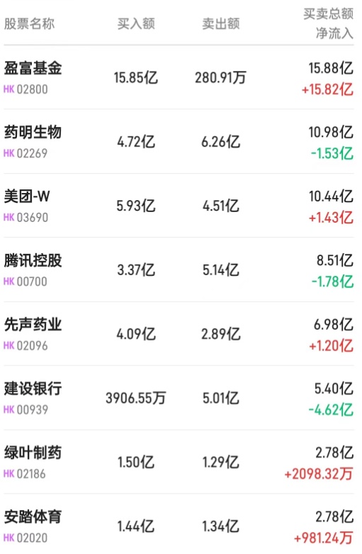 此外,盈富基金(02800)、恒生中国企业(02828)分别获净买入21.99亿、5.4亿港元。而建设银行(00939)、腾讯(00700)分别遭净卖出4.62亿、4.29亿港元。